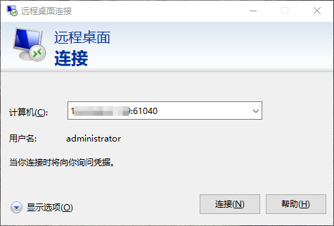 第三步:会弹出远程桌面,按刚刚复制的信息填入进去,注意带上端口号,确定输入账号密码即可。
